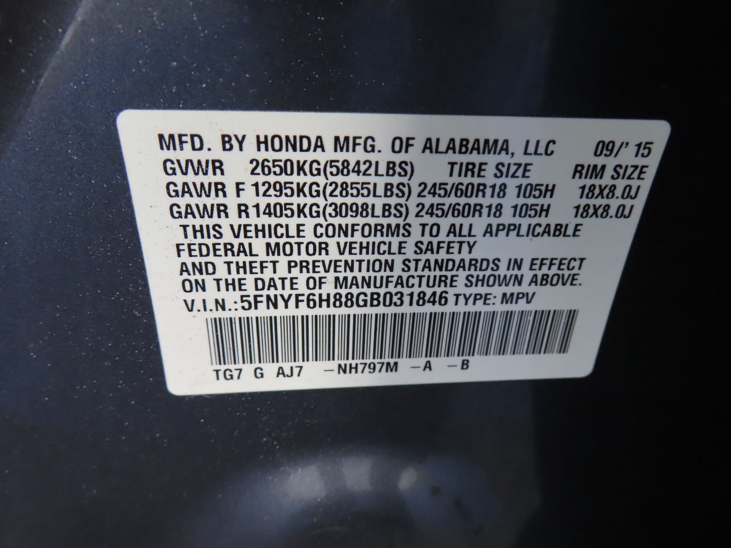 • VIN #: 5FNYF6H88GB031846