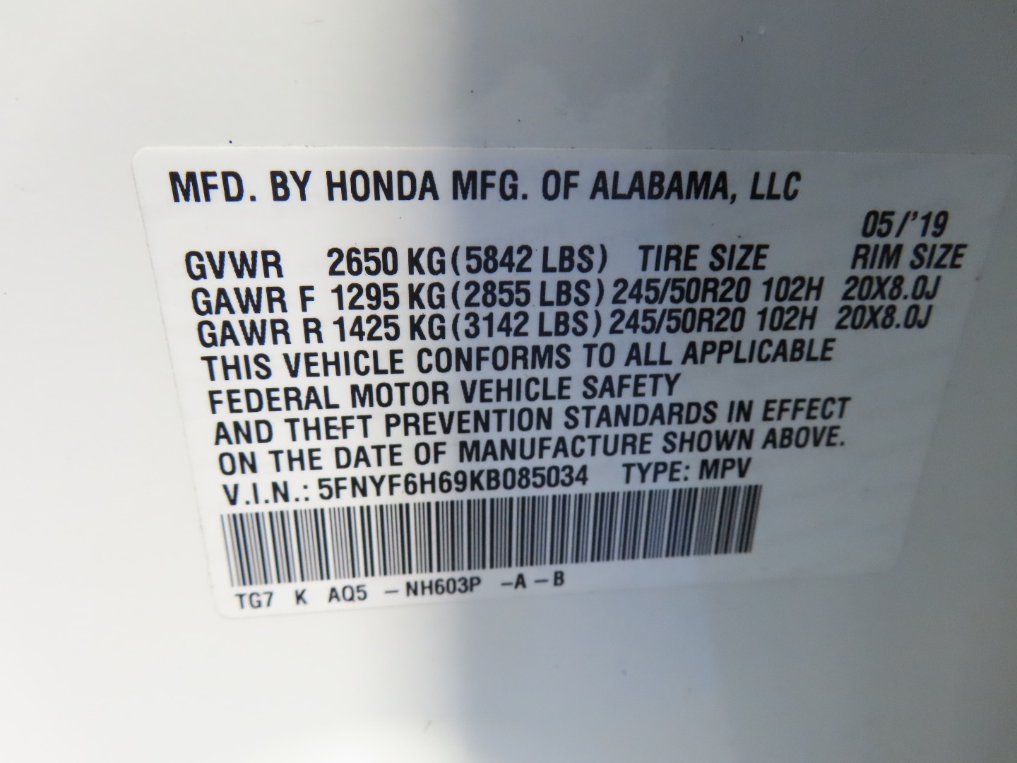 • VIN #: 5FNYF6H69KB085034