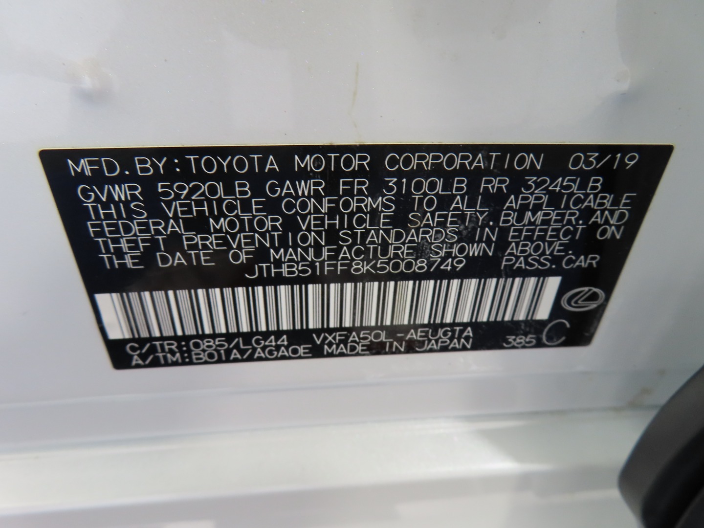 • VIN #: JTHB51FF8K5008749