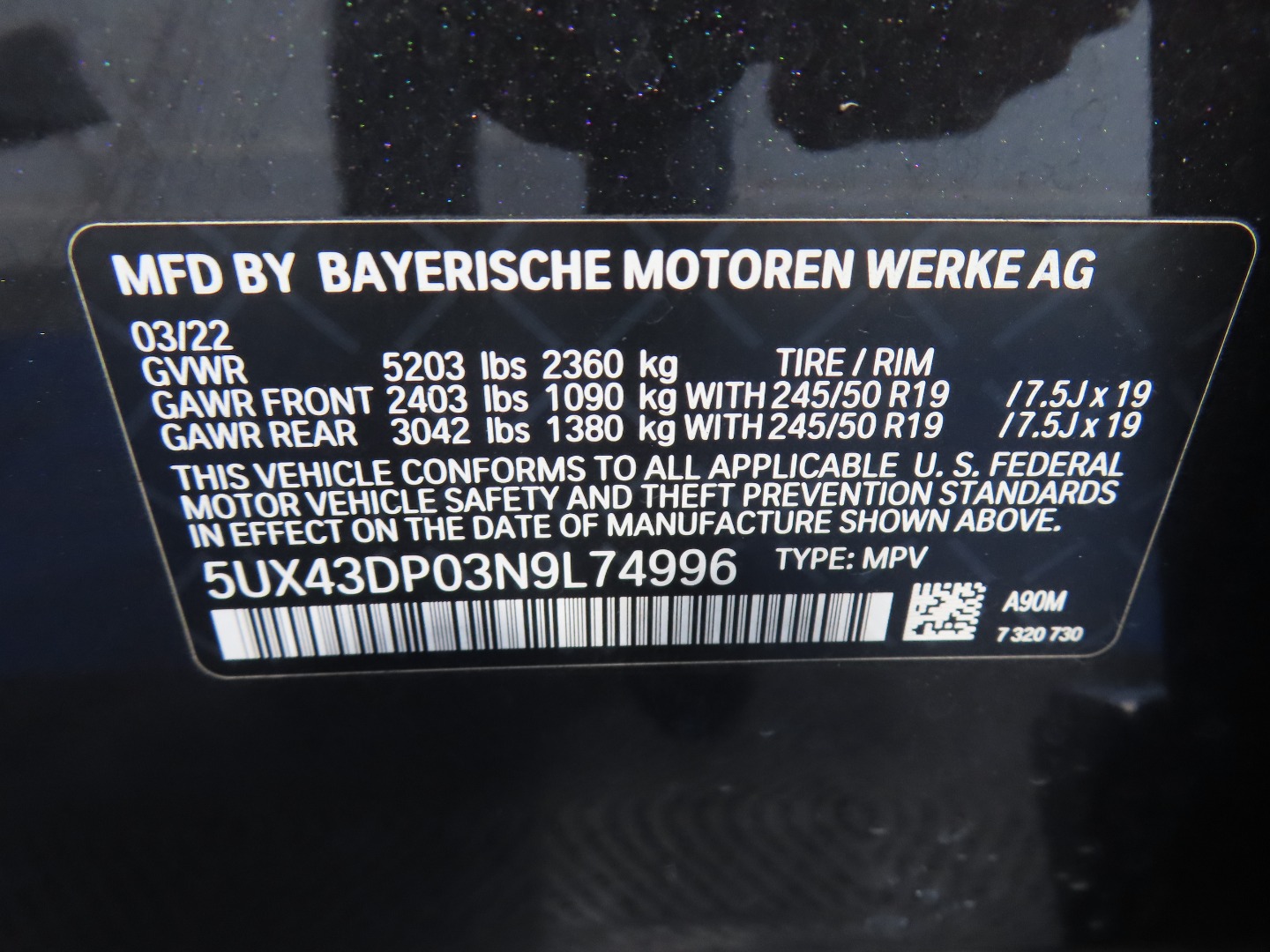 • VIN #: 5UX43DP03N9L74996