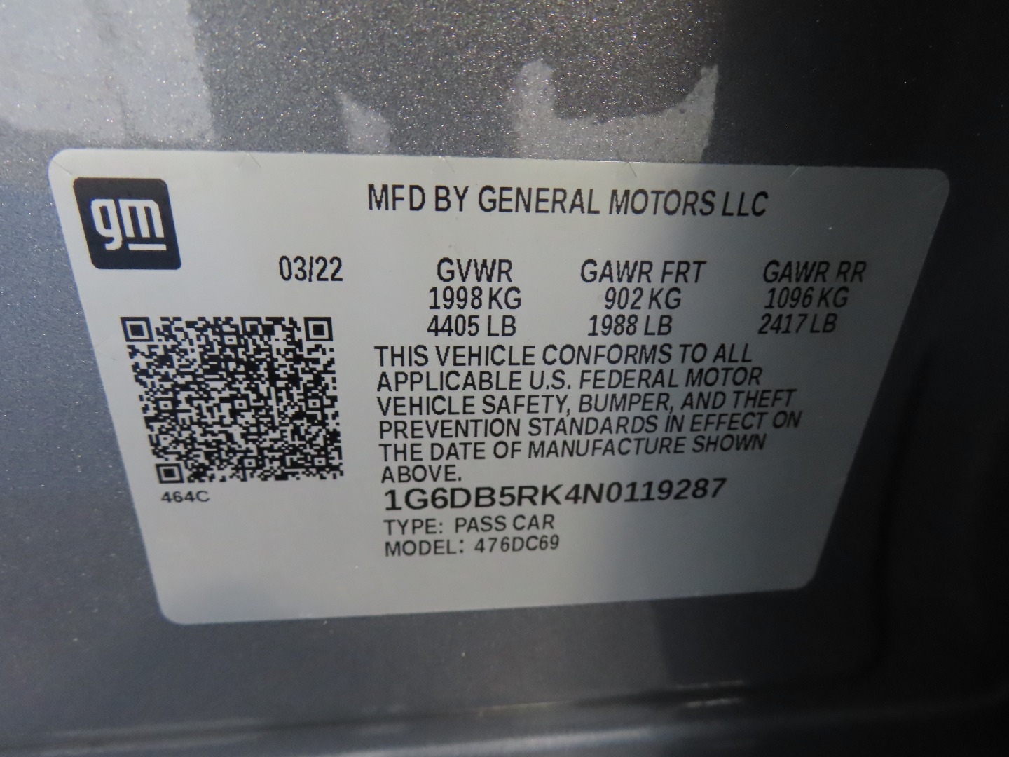 • VIN #: 1G6DB5RK4N0119287